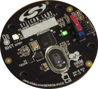 The sensor puck demonstrates Silicon Laboratories optical sensor Si1147M01 Si1147-M01, humidity and temperature sensor Si7021 and Microcontroller (EFM32G210 Gecko). The data is broadcast using a Bluetooth Low Energy (BLE) module.